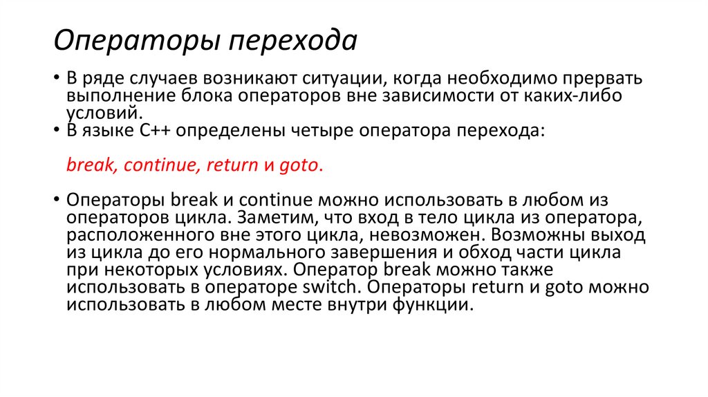 • В языке C++ определены четыре оператора перехода: