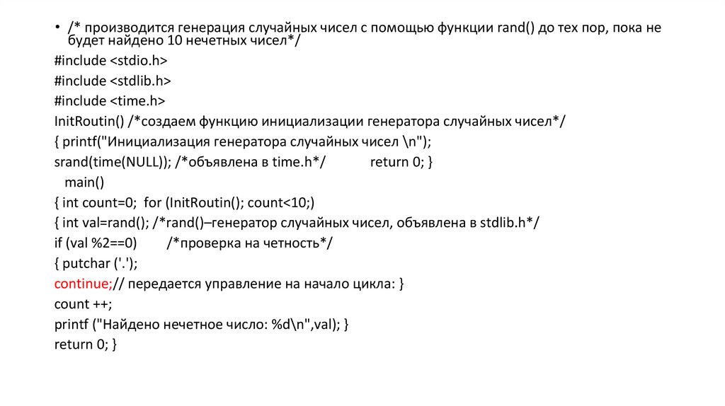 • /* производится генерация случайных чисел с помощью функции rand() до тех пор, пока небудет найдено 10 нечетных чисел*/