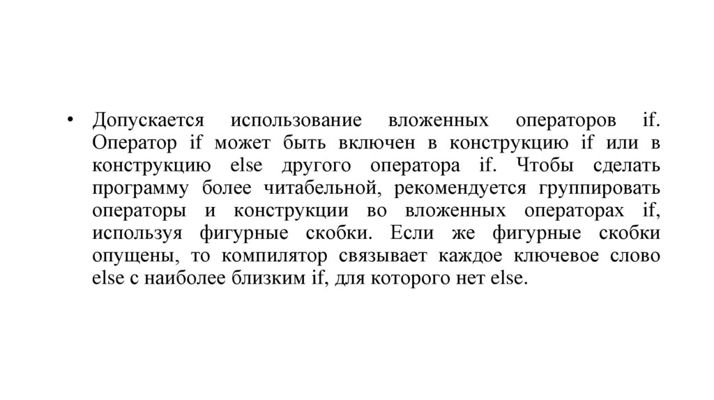 • Допускается использование вложенных операторов if.Оператор if может быть включен в конструкцию if или в