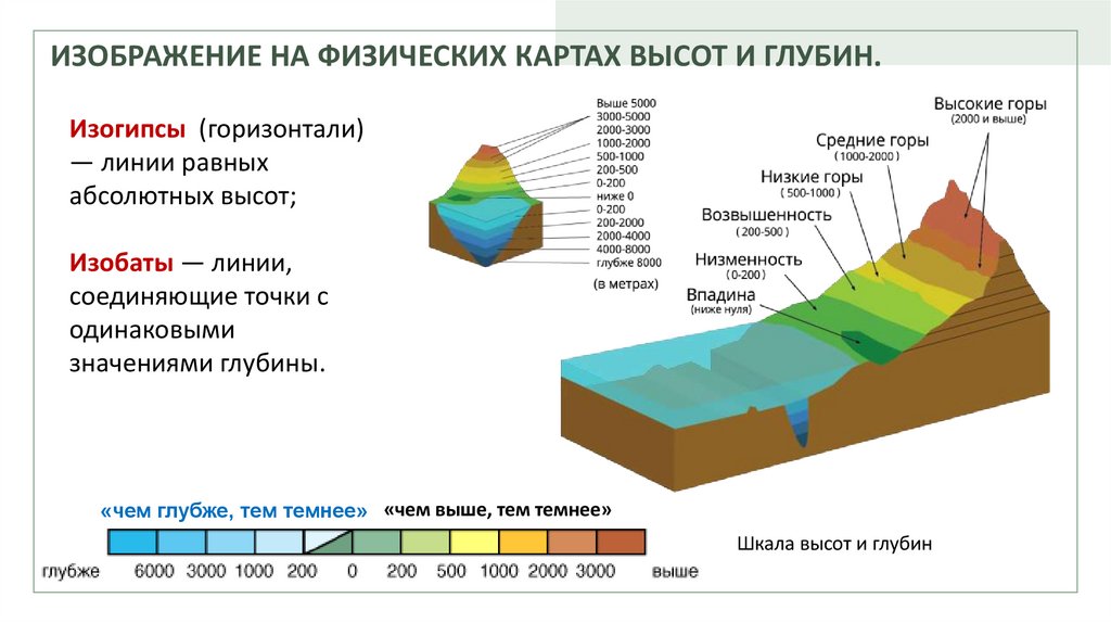 ИЗОБРАЖЕНИЕ НА ФИЗИЧЕСКИХ КАРТАХ ВЫСОТ И ГЛУБИН.Изогипсы (горизонтали)