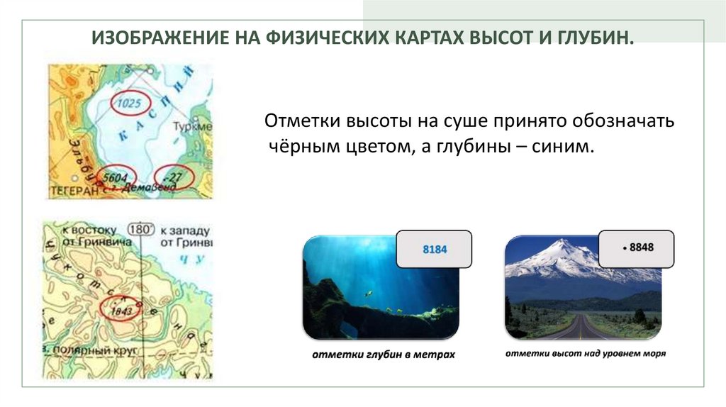 ИЗОБРАЖЕНИЕ НА ФИЗИЧЕСКИХ КАРТАХ ВЫСОТ И ГЛУБИН.Отметки высоты на суше принято обозначать