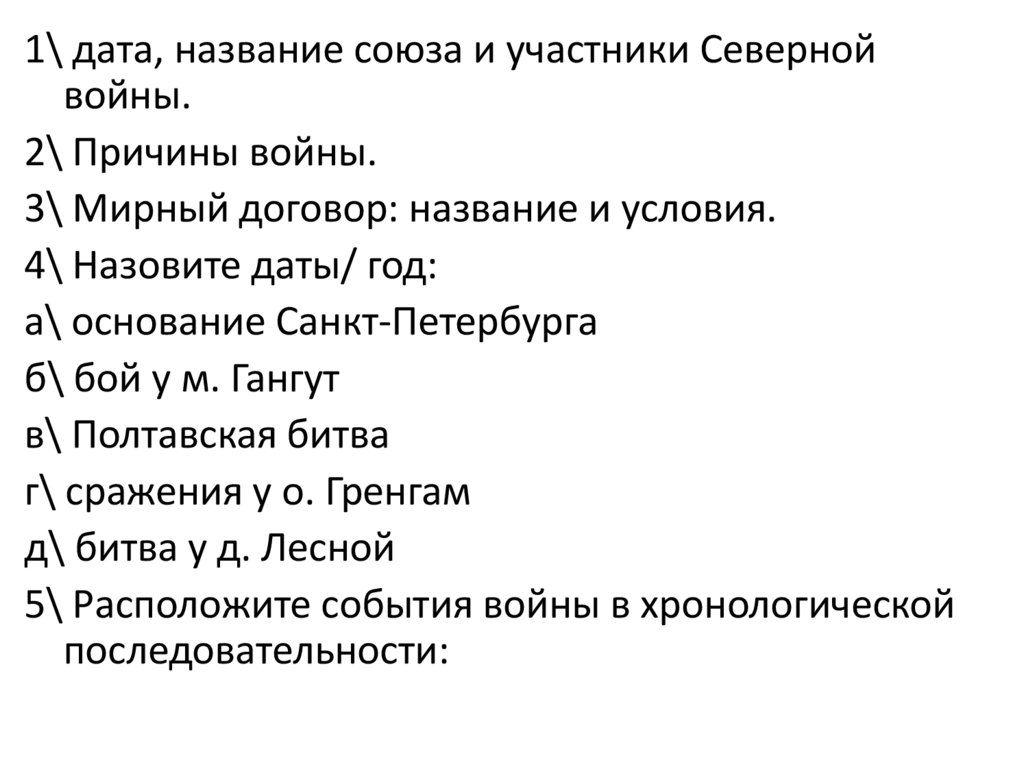 вопросы и таблица Северная война