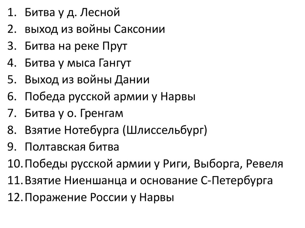 1. Битва у д. Лесной2. выход из войны Саксонии