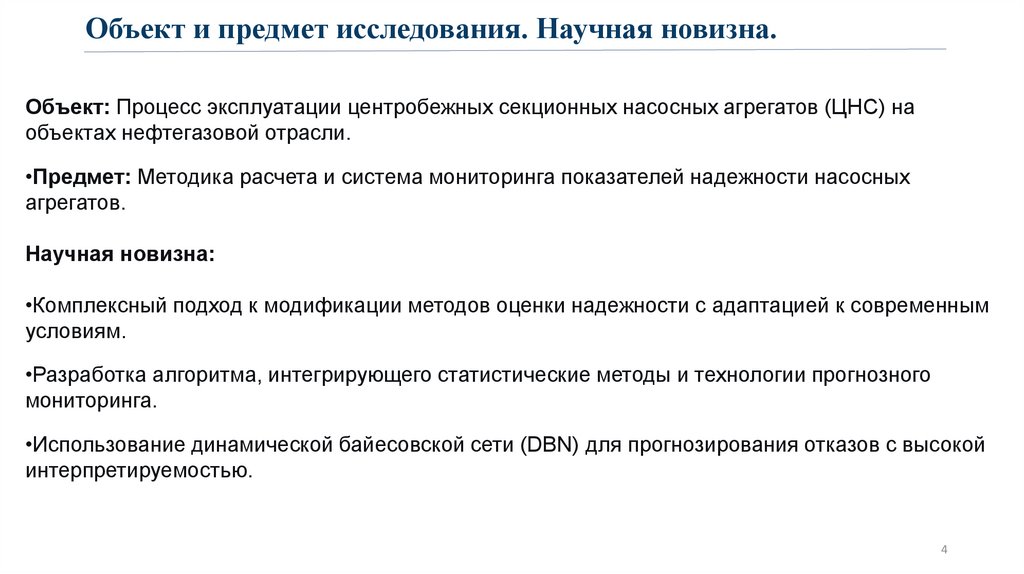 Объект и предмет исследования. Научная новизна.Объект: Процесс эксплуатации центробежных секционных насосных агрегатов (ЦНС) на