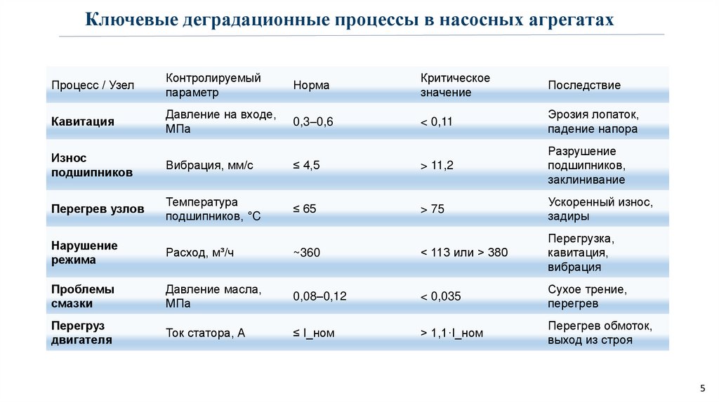 Ключевые деградационные процессы в насосных агрегатахПроцесс / Узел