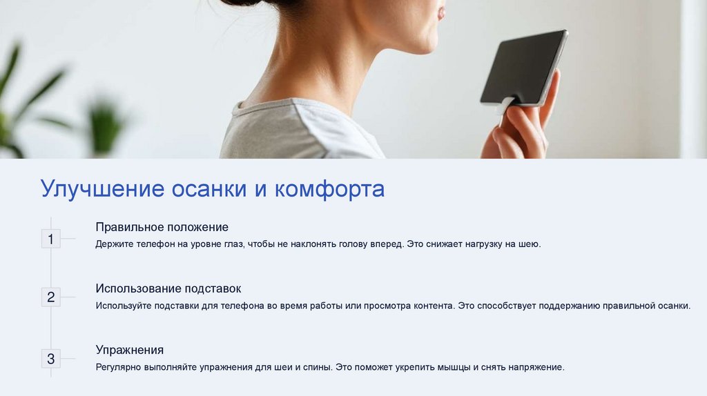 Используйте подставки для телефона во время работы или просмотра контента. Это способствует поддержанию правильной осанки.