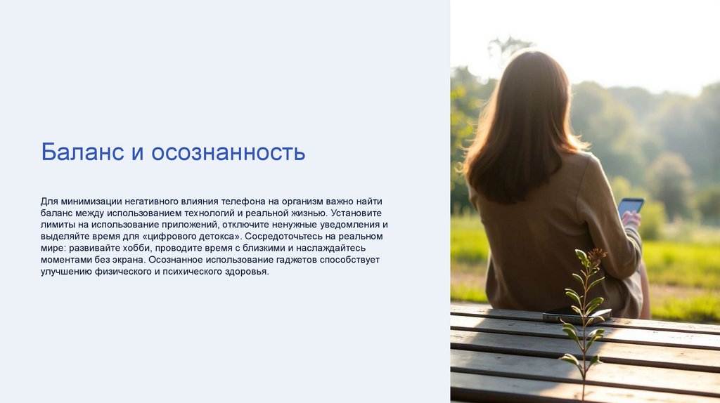 Баланс и осознанностьДля минимизации негативного влияния телефона на организм важно найти