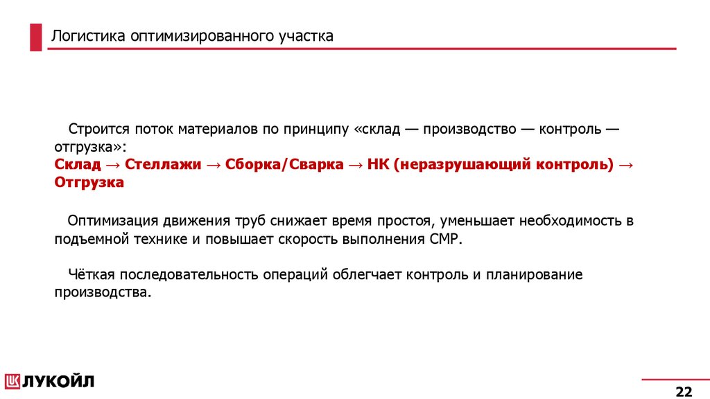 Логистика оптимизированного участкаСтроится поток материалов по принципу «склад — производство — контроль —