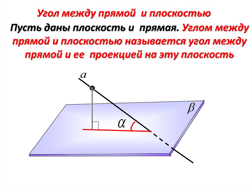 Угол между прямой и плоскостьюПусть даны плоскость и прямая. Углом между