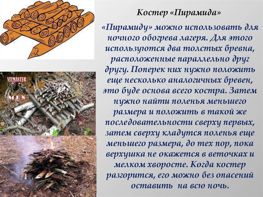 Если необходимо развести костер, который будет горетьвсю ночь, отдавая большое количество тепла, подходящим