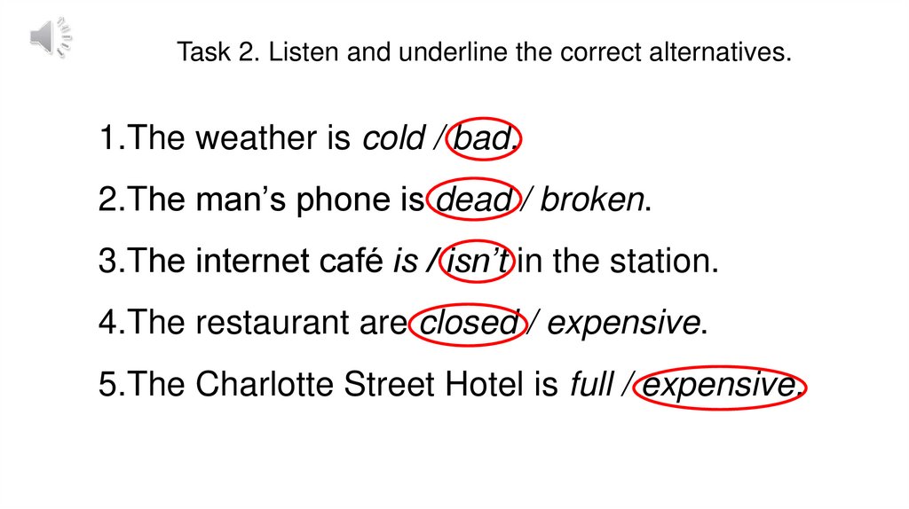 Task 2. Listen and underline the correct alternatives.1.The weather is cold / bad.