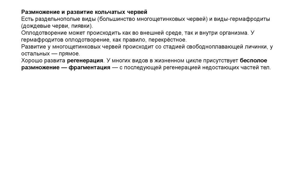 Размножение и развитие кольчатых червейЕсть раздельнополые виды (большинство многощетинковых червей) и виды-гермафродиты