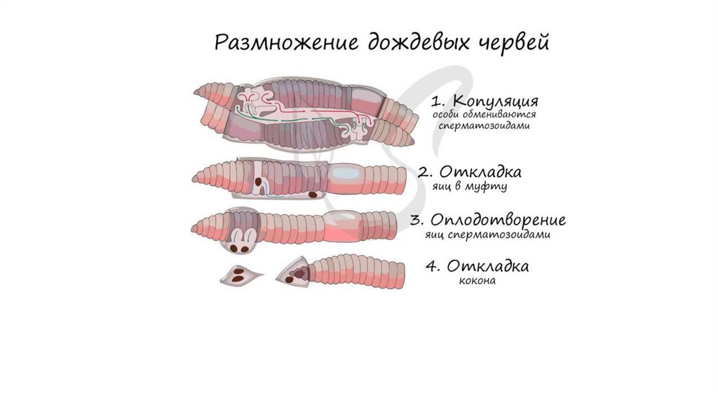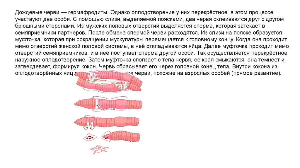 Дождевые черви — гермафродиты. Однако оплодотворение у них перекрёстное: в этом процессеучаствуют две особи. С помощью слизи, выделяемой поясками, два червя склеиваются друг с другом