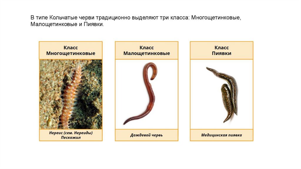 В типе Кольчатые черви традиционно выделяют три класса: Многощетинковые,Малощетинковые и Пиявки.