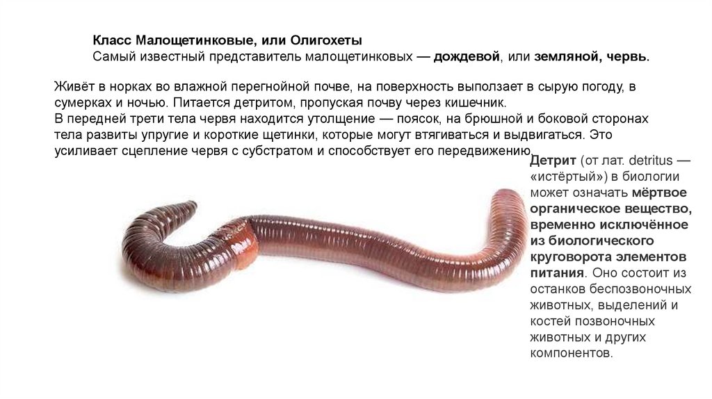 Класс Малощетинковые, или ОлигохетыСамый известный представитель малощетинковых — дождевой, или земляной, червь.