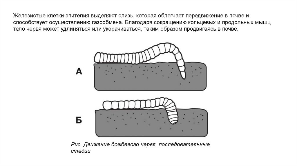 Железистые клетки эпителия выделяют слизь, которая облегчает передвижение в почве испособствует осуществлению газообмена. Благодаря сокращению кольцевых и продольных мышц