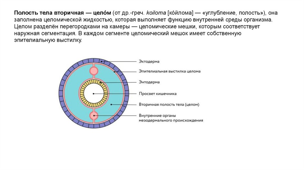 Полость тела вторичная — целóм (от др.-греч. kоiloma [кóйлома] — «углубление, полость»), оназаполнена целомической жидкостью, которая выполняет функцию внутренней среды организма.