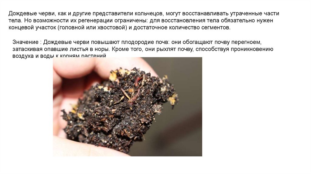 Значение : Дождевые черви повышают плодородие почв: они обогащают почву перегноем,