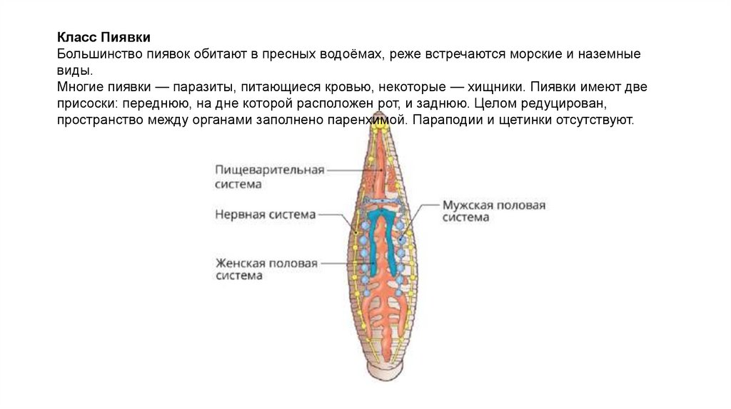 Класс ПиявкиБольшинство пиявок обитают в пресных водоёмах, реже встречаются морские и наземные