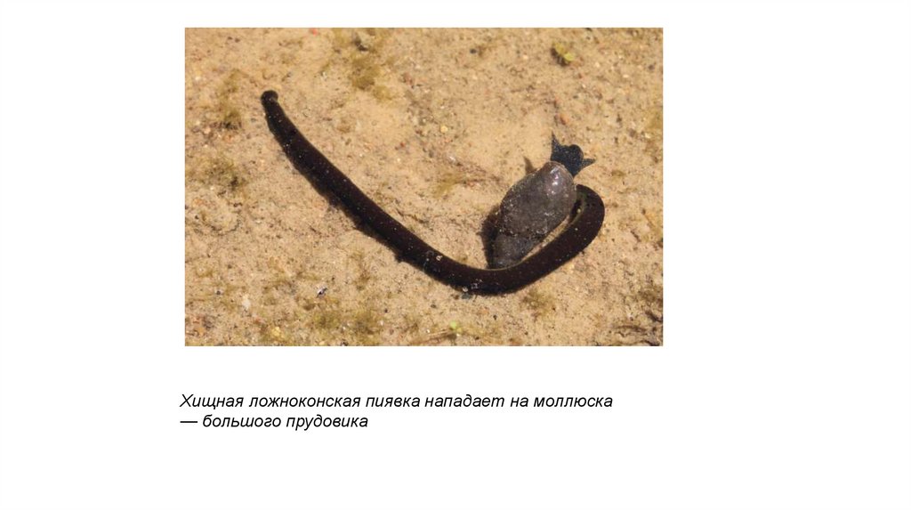 Хищная ложноконская пиявка нападает на моллюска— большого прудовика