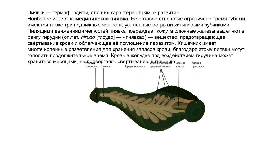 Многие пиявки — паразиты, питающиеся кровью, некоторые — хищники. Пиявки имеют две