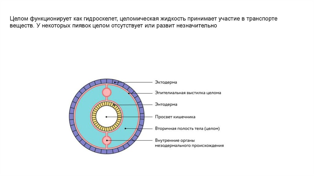 Целом функционирует как гидроскелет, целомическая жидкость принимает участие в транспортевеществ. У некоторых пиявок целом отсутствует или развит незначительно