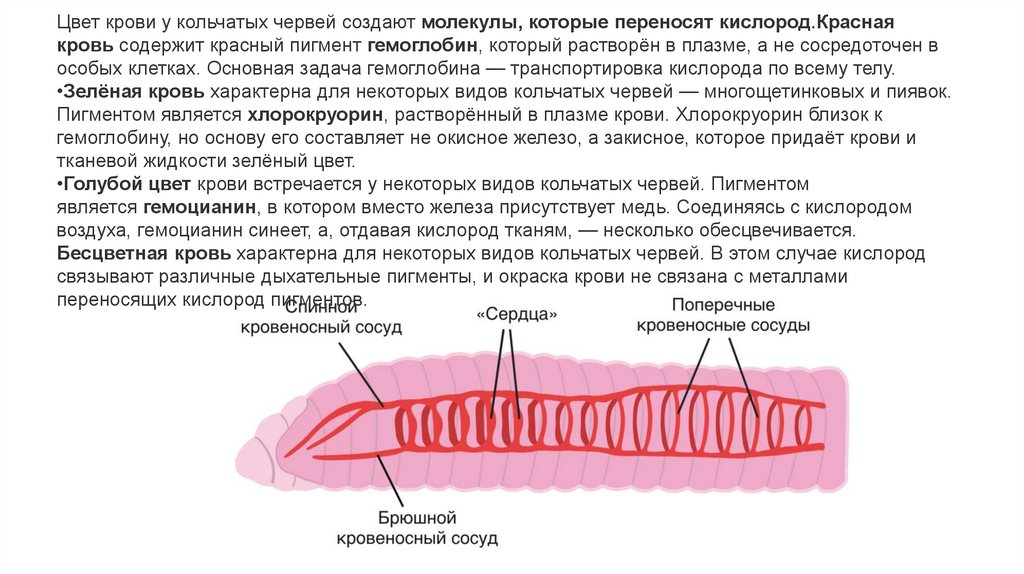 Цвет крови у кольчатых червей создают молекулы, которые переносят кислород.Краснаякровь содержит красный пигмент гемоглобин, который растворён в плазме, а не сосредоточен в