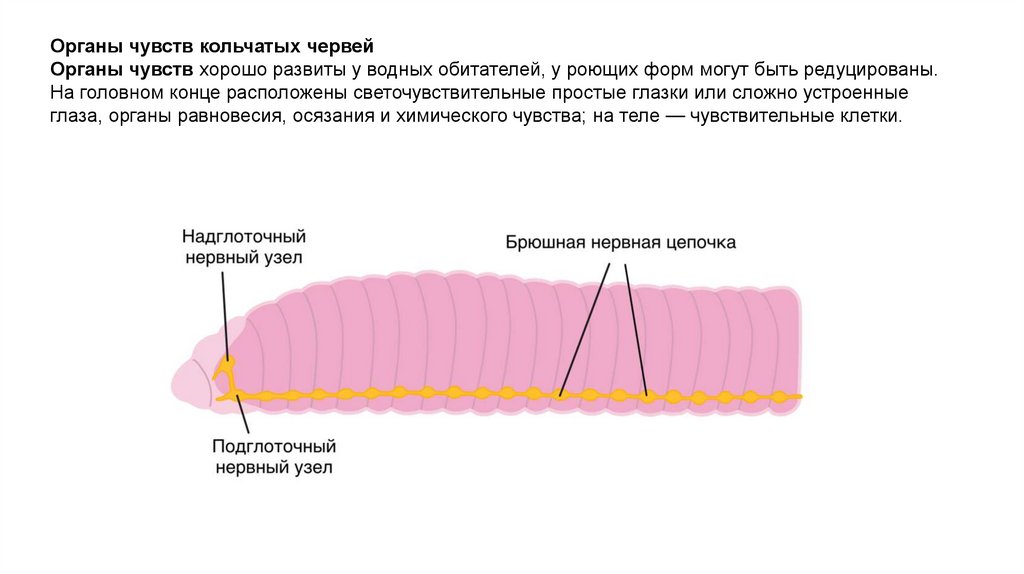 Органы чувств кольчатых червейОрганы чувств хорошо развиты у водных обитателей, у роющих форм могут быть редуцированы.