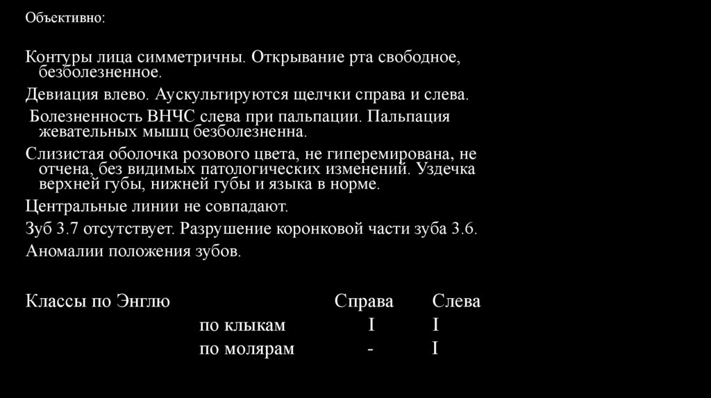 Объективно:Контуры лица симметричны. Открывание рта свободное,