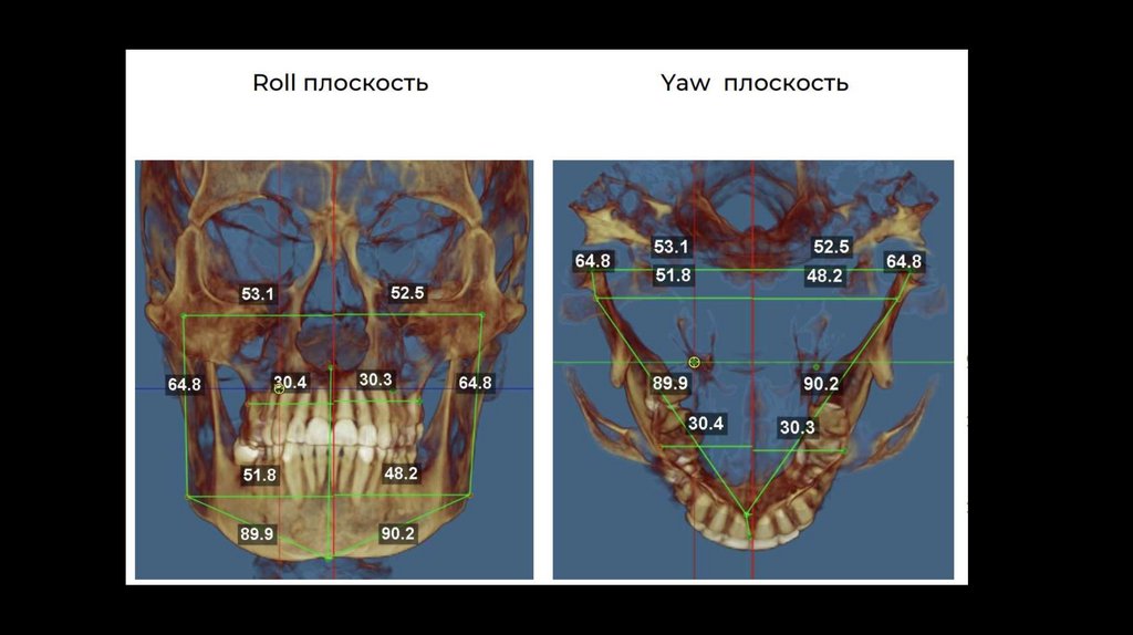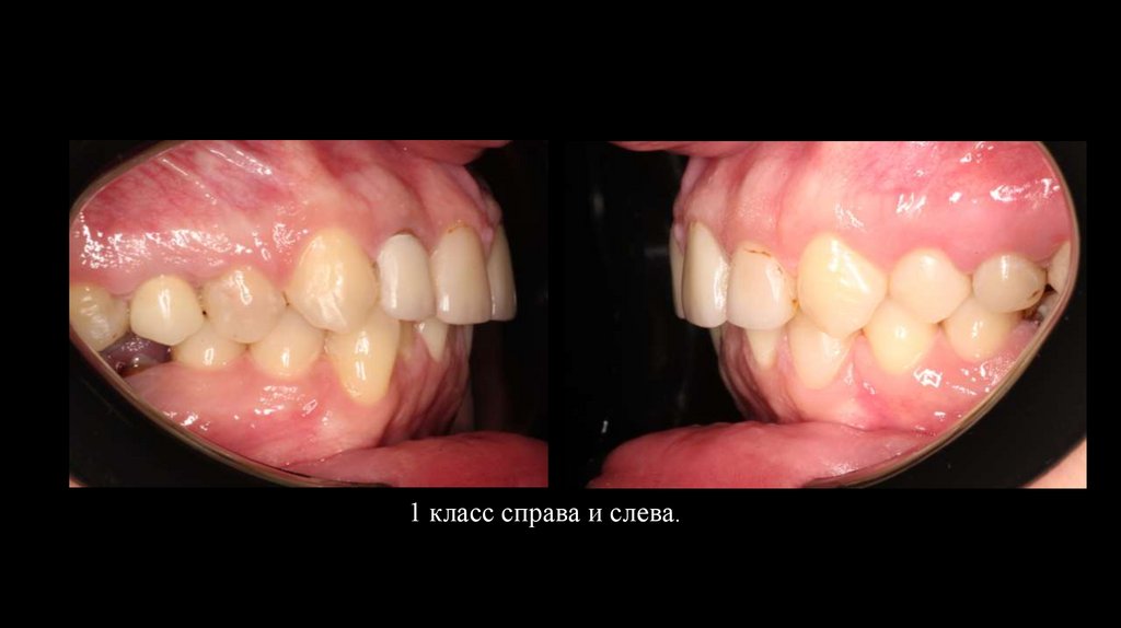 Избыточная небная инклинация жевательных зубов.Центры верхнего и нижнего зубных рядов не совпадают.
