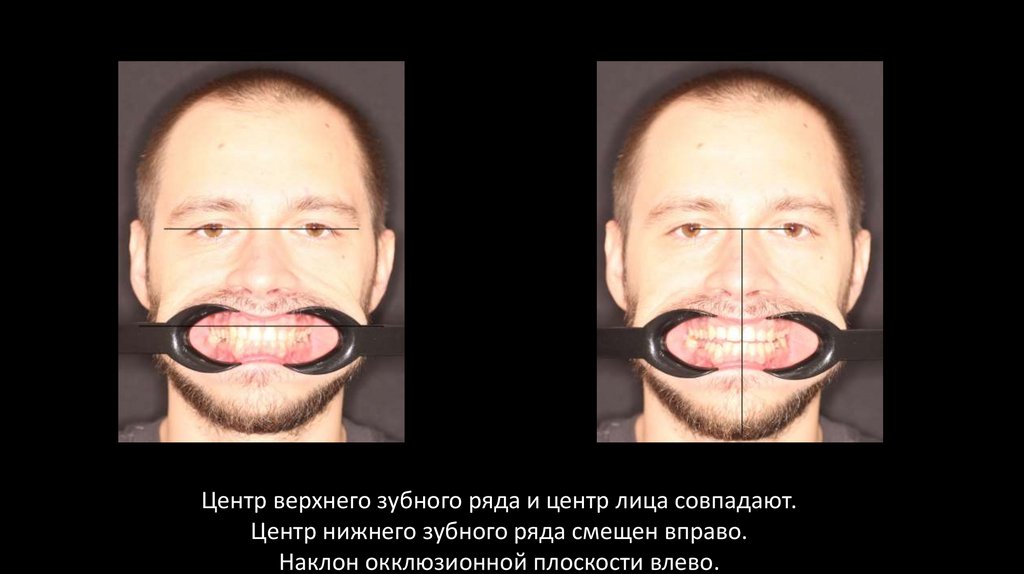 Центр верхнего зубного ряда и центр лица совпадают.Центр нижнего зубного ряда смещен вправо.
