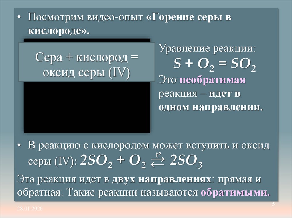 • Посмотрим видео-опыт «Горение серы вкислороде».