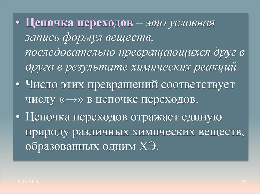 • Цепочка переходов – это условнаязапись формул веществ,