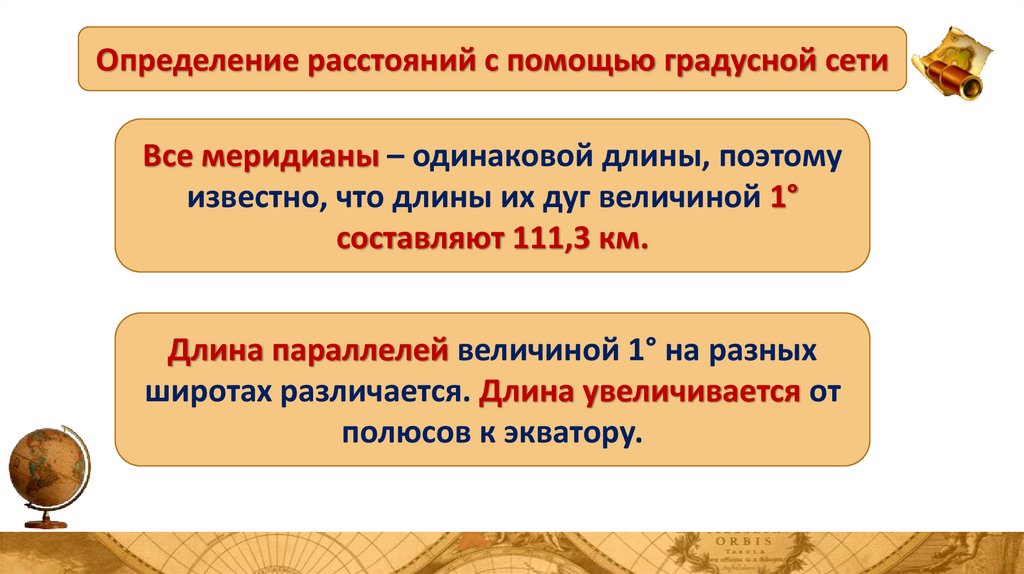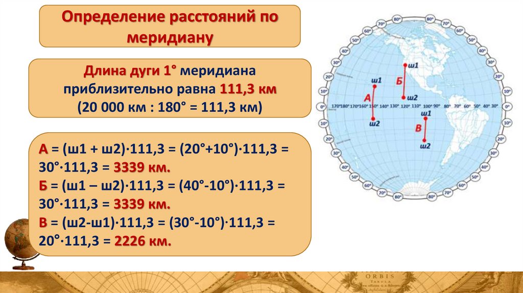 Определение расстояний с помощью градусной сетиВсе меридианы – одинаковой длины, поэтому