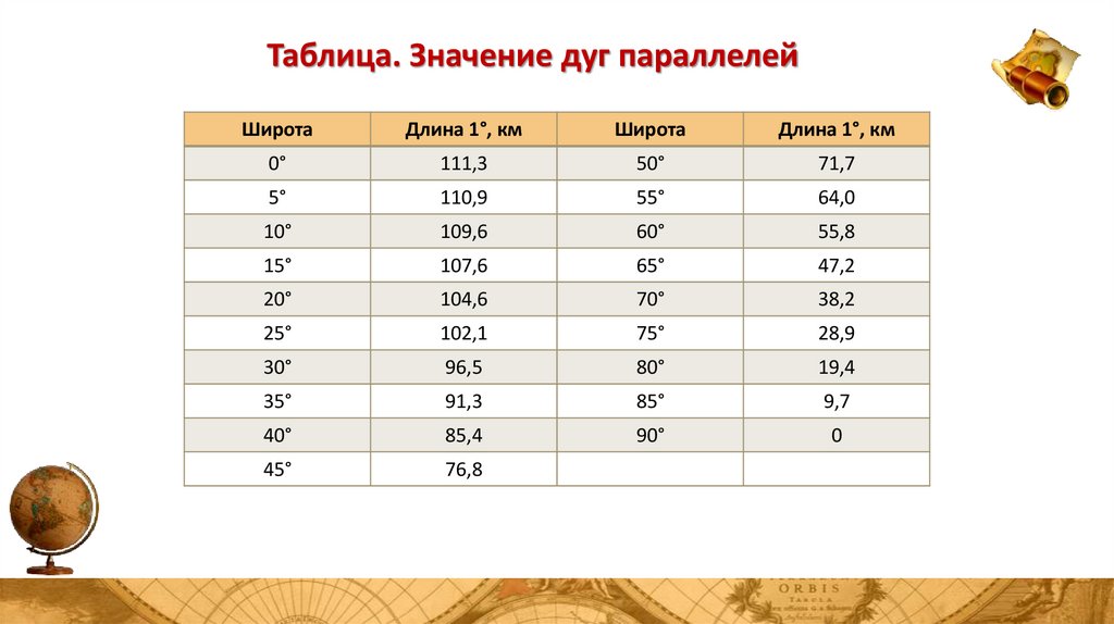 Таблица. Значение дуг параллелейШирота