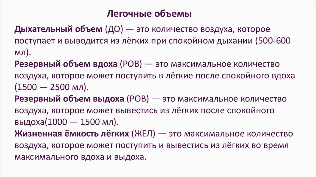 Легочные объемыДыхательный объем (ДО) — это количество воздуха, которое