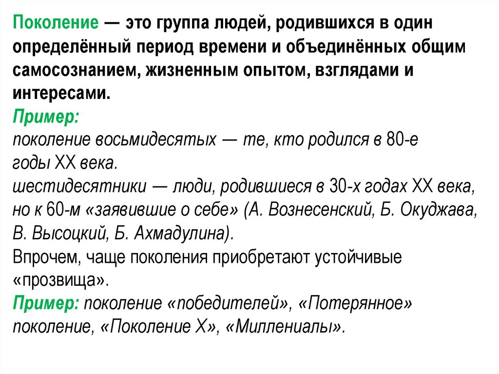 Поколение — это группа людей, родившихся в одинопределённый период времени и объединённых общим