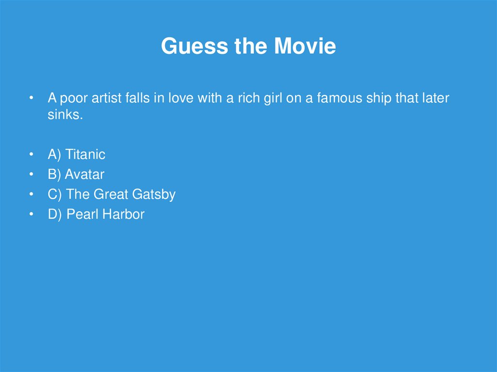 Guess the Movie• A poor artist falls in love with a rich girl on a famous ship that later