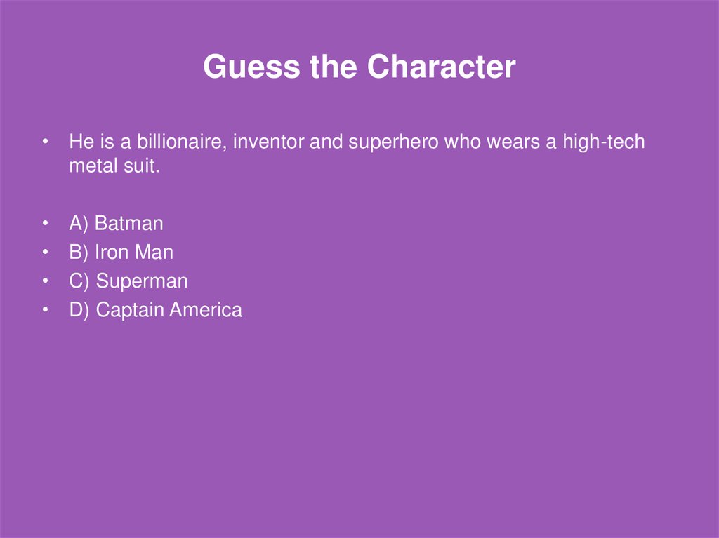 Guess the Character• He is a billionaire, inventor and superhero who wears a high-tech