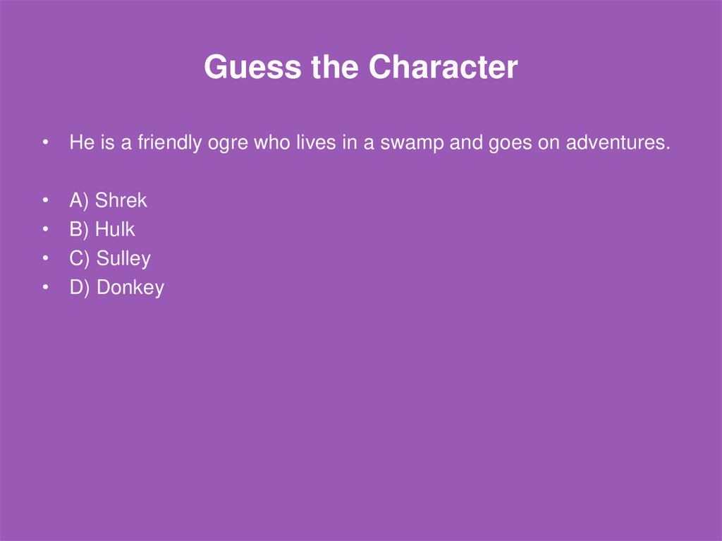 Guess the Character• He is a friendly ogre who lives in a swamp and goes on adventures.