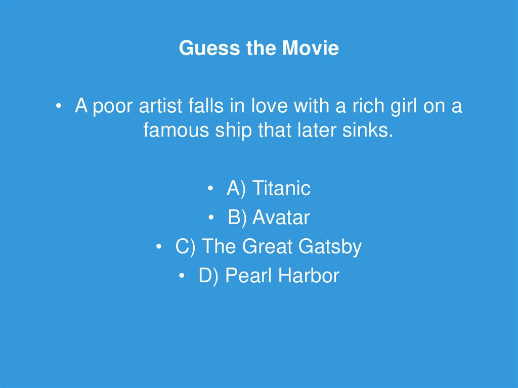 Guess the Movie• A poor artist falls in love with a rich girl on a