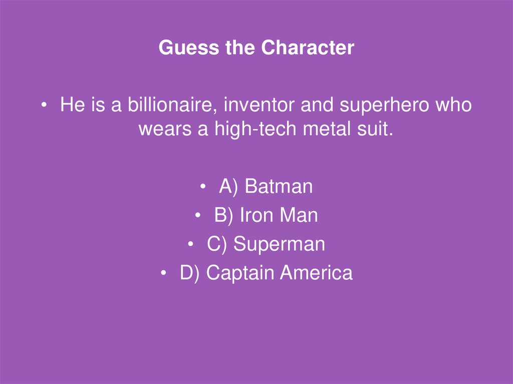 Guess the Character• He is a billionaire, inventor and superhero who