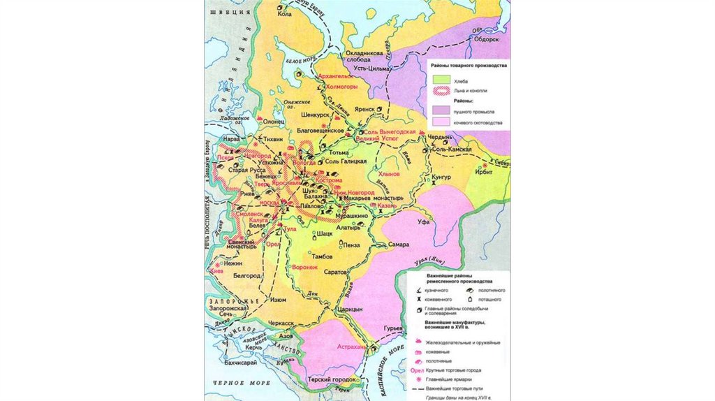 3. Рост и развитие городов (к к.17 века около 300, самые крупные Москва и Тула)4. Формируется специализация районов – выпуск областью определённого товара. Товарный хлеб, технические культуры