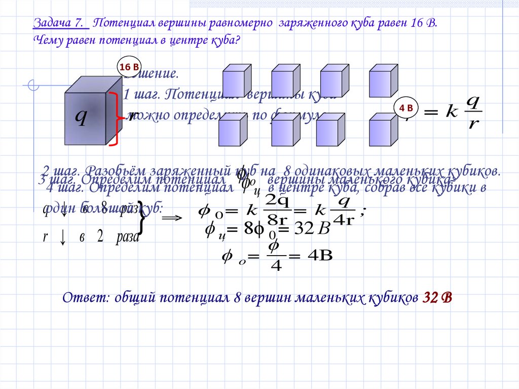 Задача 7. Потенциал вершины равномерно заряженного куба равен 16 В.Чему равен потенциал в центре куба?