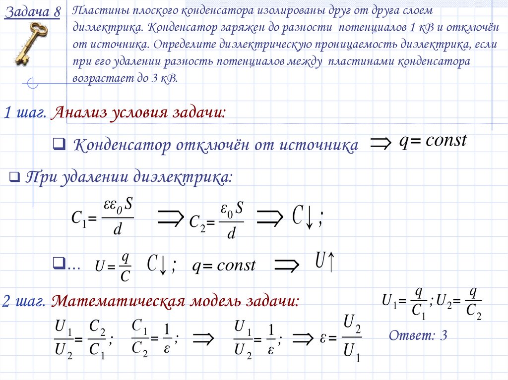 Задача 8 Пластины плоского конденсатора изолированы друг от друга слоемдиэлектрика. Конденсатор заряжен до разности потенциалов 1 кВ и отключён
