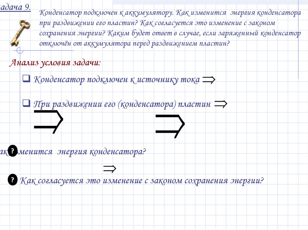 Задача 9. Конденсатор подключен к аккумулятору. Как изменится энергия конденсаторапри раздвижении его пластин? Как согласуется это изменение с законом
