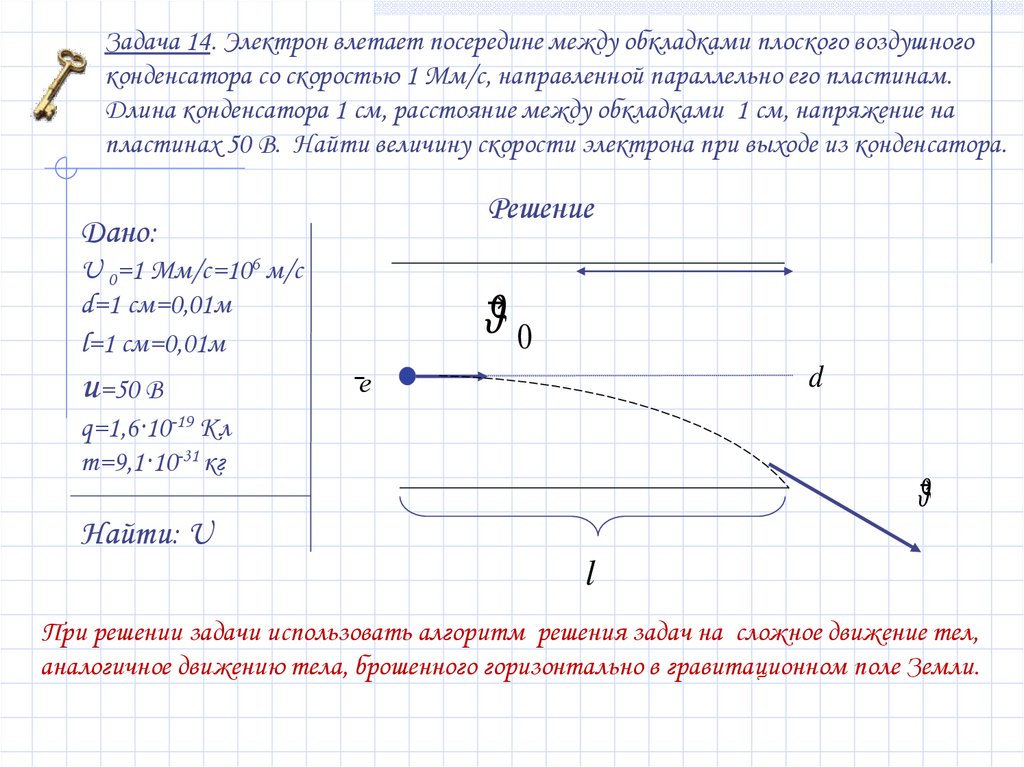 Задача 14. Электрон влетает посередине между обкладками плоского воздушногоконденсатора со скоростью 1 Мм/с, направленной параллельно его пластинам.