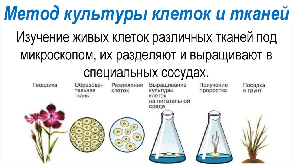 Метод культуры клеток и тканейИзучение живых клеток различных тканей под
