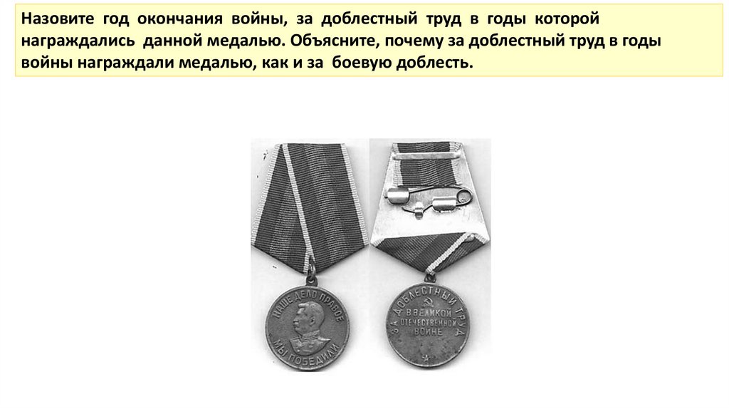 Назовите год окончания войны, за доблестный труд в годы которойнаграждались данной медалью. Объясните, почему за доблестный труд в годы