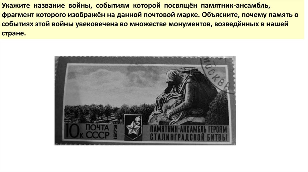 Укажите название войны, событиям которой посвящён памятник-ансамбль,фрагмент которого изображён на данной почтовой марке. Объясните, почему память о